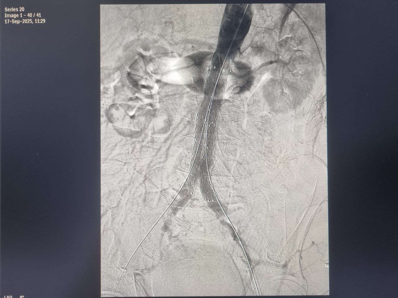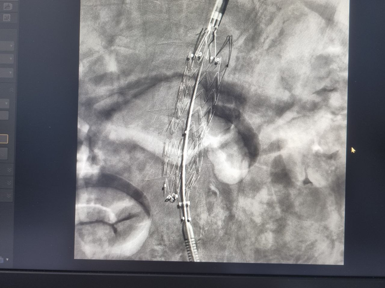 После тщательного обследования в ходе ангиографического исследования у пациента были обнаружены признаки нестабильности в просвете аневризмы, а также критическое поражение устья левой почечной артерии, вовлеченное в аневризму брюшной аорты.