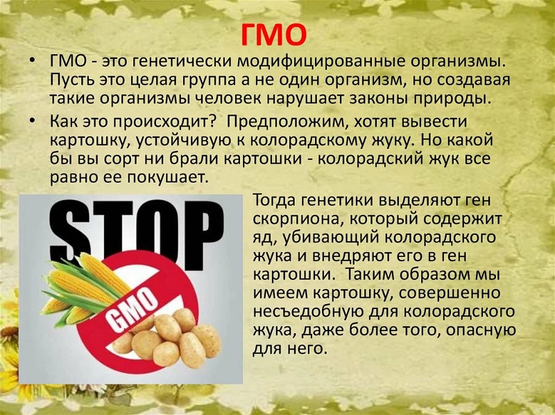 - продукты, получаемые в итоге переработки генетически модифицированного материала (например, соевое молоко, чипсы, кукурузные хлопья).