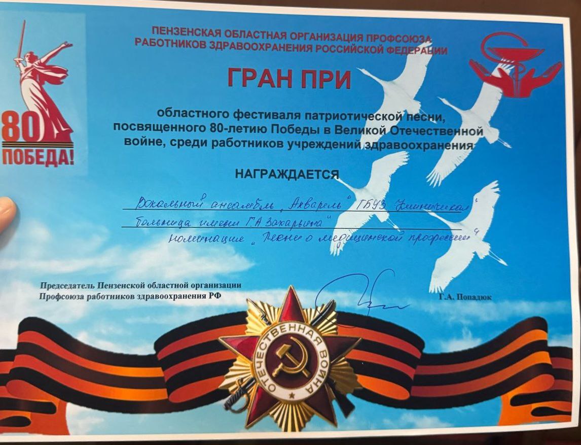 Хоровой коллектив «Акварель» клинической больницы № 6 получил ГРАН ПРИ Областного фестиваля патриотической песни, посвященном 80-летию Победы в Великой Отечественной войне